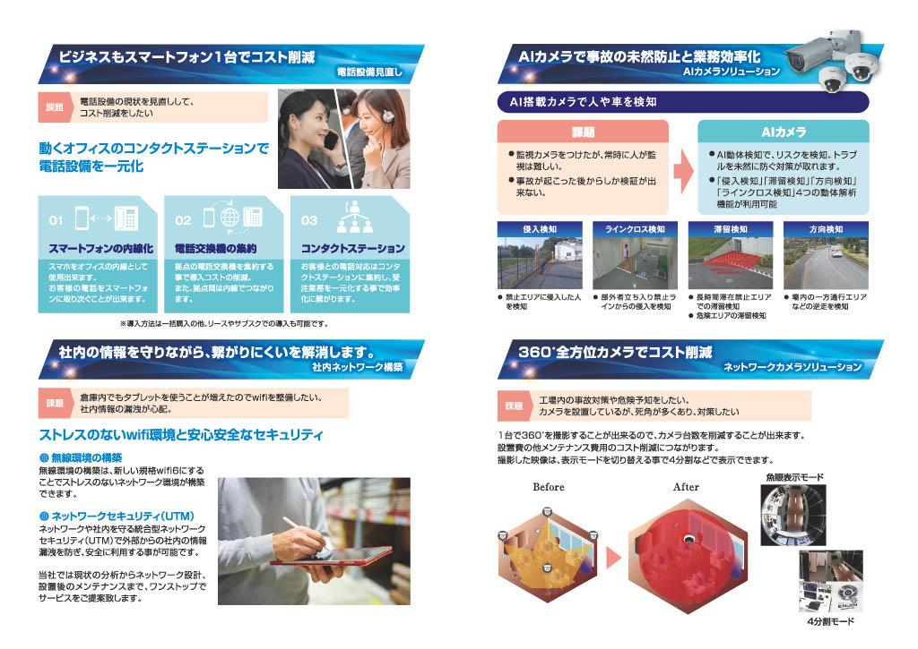 電話設備 / ネットワーク / Wi-Fi / AIカメラ / ネットワークカメラ / 顔認証システム / 入退管理システム / ナンバー認識 / IP無線機 / オフィス什器・備品 / テレビCM・動画制作 / ホームページ制作 / 採用サイト制作 / 広告運用支援 / SNS運用支援 / 会社案内・パンフレット制作 ほか