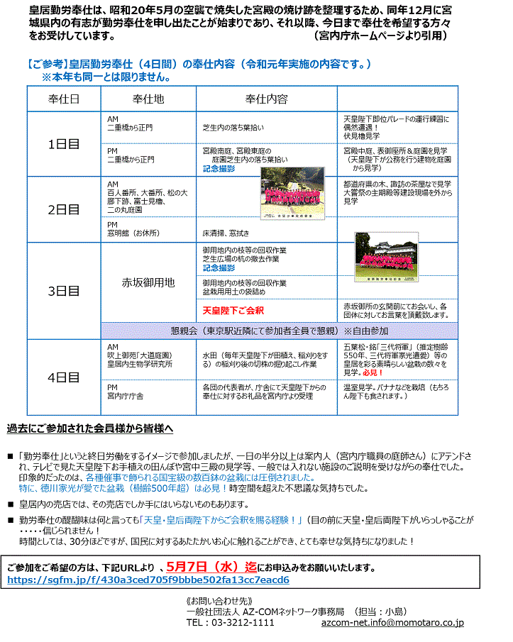 4日間の非日常的な奉仕活動と普段接することのあまりない皇居・赤坂御用地に身を置くことで、心に響く何かを感じることが出来るものと存じます。